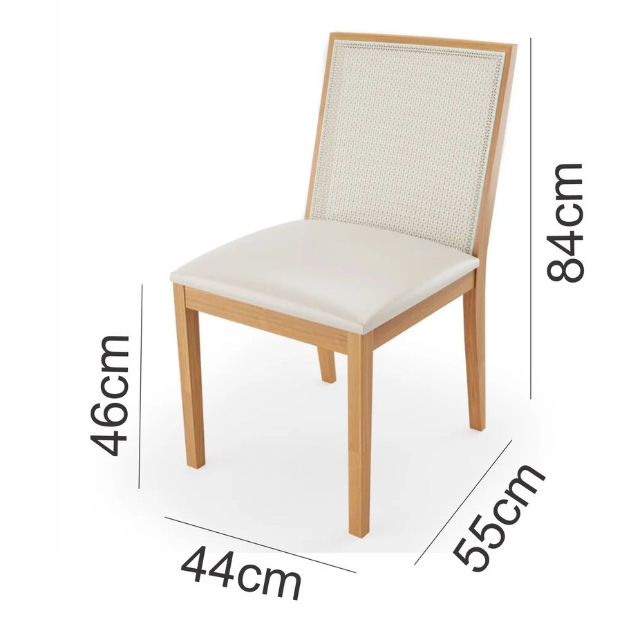 O encosto em palhinha sextavada sintética confere leveza visual e toque de requinte artesanal, enquanto o assento estofado com espuma D23 e revestimento em facto bege oferece conforto ergonômico para o dia a dia.