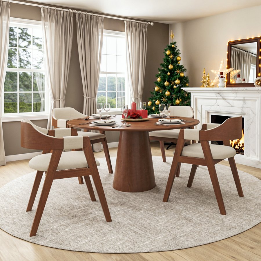 O Conjunto Mesa Agnes e Cadeiras Âmbar foi criado para transformar sua sala de jantar em um ambiente acolhedor e sofisticado. A mesa redonda, em madeira de alta qualidade, apresenta base com design atemporal, perfeita para reunir família e amigos em momentos especiais. As Cadeiras Âmbar complementam a composição com seu estilo moderno, estrutura em madeira e assento estofado no elegante tecido linho rústico bege, que traz aconchego e versatilidade para diferentes estilos de decoração.
