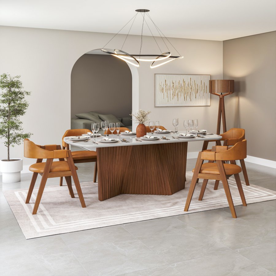 Porque ele une design moderno, qualidade e conforto em uma composição elegante que transforma a sala de jantar em um ambiente mais acolhedor, sofisticado e cheio de personalidade.